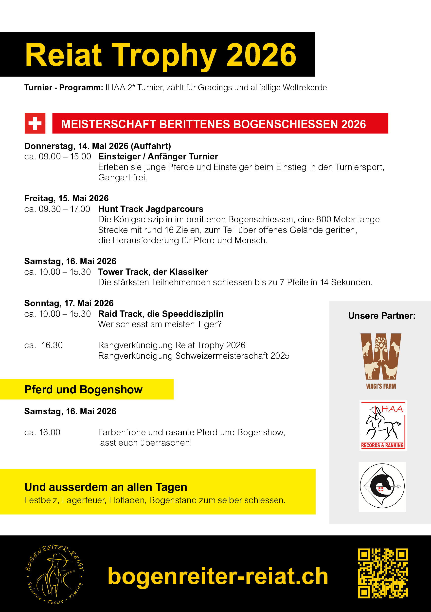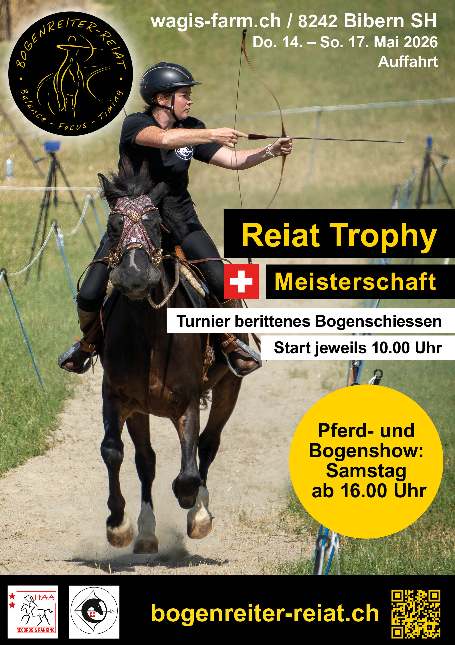 Bogenreiter Reiat organisiert jedes jahr die bereits traditionelle Reiat Trophy im Kanton Schaffhausen. Jeweils über die Auffahrtstage trifft sich hier die Schweizer Bogenreiter Szene zum sportlichen Kräftemessen.